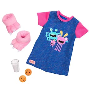 Pijama com estampa de monstrinhos fofos para bonecas de 46cm. Prepare-se para um bom cochilo. Esse pijama irá mostrar que alguns monstros fofinhos são muito divertidos! Vista suas bonecas favoritas com a camisola azul e rosa brilhante com uma adorável estampa de monstro de desenho animado na frente e termine o visual com um par de chinelos de pelúcia grandes em forma de dedos de monstro. E o que os monstros famintos gostam de comer antes de dormir? Biscoitos e leite, claro! Dê as comidinhas antes de dormir para que suas barrigas de monstro não fiquem roncando durante a noite. De festas do pijama a apenas dormir, o pijama Our Generation garantirá que suas bonecas tenham bons sonhos. Boneca vendida separadamente.