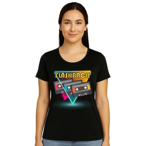 Reviva a nostalgia com a Camiseta Adulta Manga Curta Temática Flash Back Estampa Fitas, perfeita para quem ama o estilo retrô e quer expressar personalidade única no dia a dia. Confeccionada em tecido leve e confortável, oferece modelagem que valoriza o corpo com liberdade de movimento. A estampa vibrante com fitas cassete e o letreiro “FLASHBACK” trazem um toque vintage autêntico, resgatando memórias dos anos 80 e 90 com estilo moderno.
