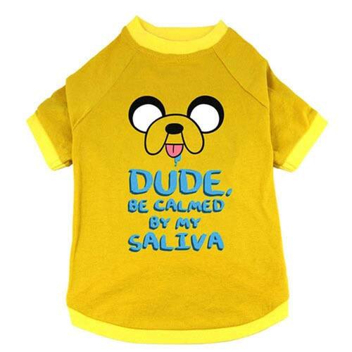 - Esta camiseta divertida apresenta o rosto de Jake com o texto "Dude, Be Calmed By My Saliva".