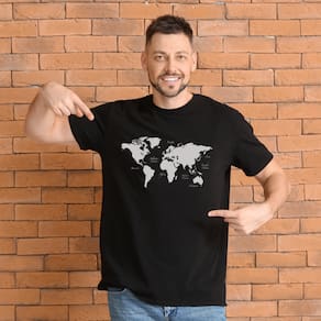 ***Para estampas em camiseta escura, o processo de produção exige um tratamento no tecido com um composto chamado primer. Esse composto pode eventualmente deixar uma leve marca no entorno da estampa que desaparece num curto espaço de tempo ou na primeira lavagem. ***