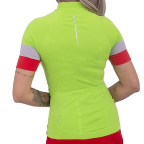 Possui zíper na gola, bolso com três divisões na parte inferior traseira e detalhes refletivos
