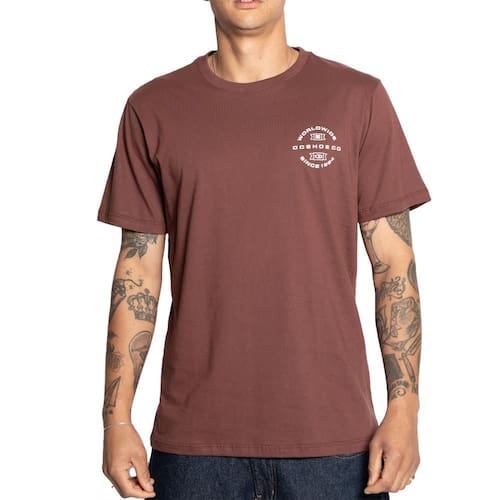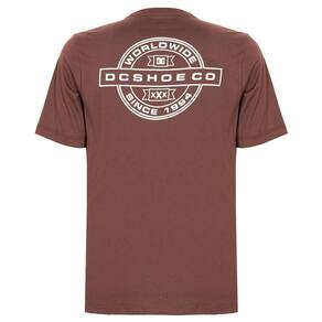 Camiseta Dc Shoes feita em modelagem regular, meia malha 30.1, estampa frente e costas e etiquetas personalizadas.