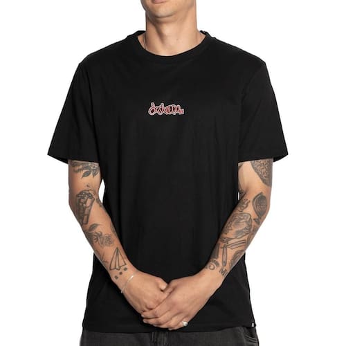 Camiseta Dc Shoes feita em modelagem regular, meia malha 30.1, estampa frontal e etiquetas personalizadas.
