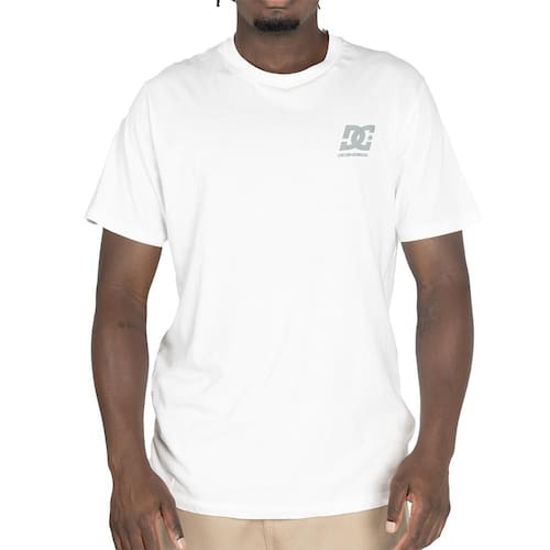 Camiseta Dc Shoes feita em modelagem regular, meia malha 30.1, estampa no peito e etiquetas personalizadas.