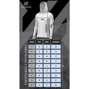 Camiseta de pesca manga longa com capuz Mar Negro Sublimada capuz Dark\nDescubra a Camiseta de pesca manga longa com capuz Mar Negro Sublimada capuz Dark, a escolha perfeita para pescadores que buscam proteção, conforto e estilo em uma única peça. Desenvolvida com tecido tecnológico de alta performance, oferece proteção UV, secagem rápida e respirabilidade, essencial para longas jornadas ao ar livre. O design sublimado garante durabilidade da estampa e conforto térmico, enquanto o capuz ajustável protege contra sol e vento. Além disso, a modelagem anatômica com punhos que permitem encaixe no polegar proporciona liberdade de movimento e segurança. Ideal para quem valoriza performance e resistência em ambientes desafiadores.\nPrincipais benefícios: - Proteção UV alta para pele protegida durante o dia - Tecido leve, respirável e de secagem rápida - Design sublimado resistente ao desgaste - Capuz cruzado ajustável para maior proteção contra intempéries - Modelagem confortável com punhos para fixação nas mãos - Visual discreto e moderno com padrão camuflado Dark\nInvista em qualidade e performance para suas aventuras de pesca com esta camiseta que une funcionalidade e estilo na medida certa.\nTabela de medidas:\nTAMANHO TÓRAX (cm) MANGA (cm) COMPRIMENTO (cm) P 48 64 66 M 50 66 70 G 54 68 72 GG 56 69 73 G1 61 71 75 G2 64 73 78 G3 66 74 80\n Marca: Não Informado Marca: Não Informado Marca: Não Informado