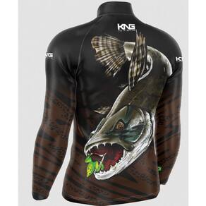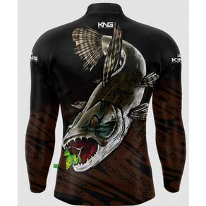 CAMISETA DE PESCA KING BRASIL COM PROTEÇÃO UV 50+ (KFF644) \nCamisa com proteção Solar, Tamanhos P ao XG \nProtege a Pele dos Efeitos nocivos do Sol \nUv protection e o fio inteligente que protege sua pele da ação dos raios UV-A e UV-B com fator de proteção solar de 30+ a 50+. \nPara os mais exigentes, as camisas da King Brasil com proteção UV protegem a pele durante a exposição ao sol com maior conforto e funcionalidade. \nDevido a modificações no DNA do fio, essa funcionalidade tem ação prolongada durante toda vida útil do produto. \nE a alta tecnologia e segurança que você sente na pele. \n- 100% poliéster\n- Proteção Solar UV\n- Impressão é feita em papel Epson de alta qualidade durável toda vida útil do produto.\n- Gola padre\n- Corte raglã\n- Tecido Tecno Dry Fit \n- Tecnologia de alta Absorção\n- Tecido leve\n- Conforto Térmico\n