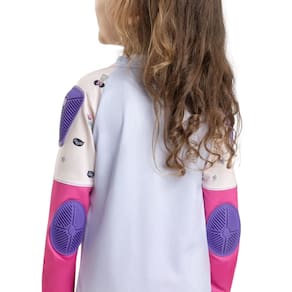 Confeccionada em tecido macio e leve, ela proporciona sensação agradável ao toque, permitindo liberdade de movimento. Sua parte traseira possui material respirável, que favorece a circulação do ar e mantém a criança fresca mesmo nos dias mais quentes. Com proteção solar UV 50+, ela oferece segurança contra os raios solares, além de contar com proteção adicional nos ombros e cotovelos, garantindo ainda mais proteção durante brincadeiras e aventuras.