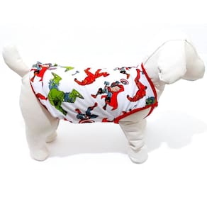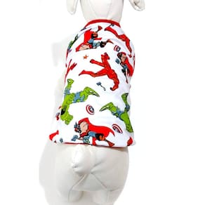 Pijama confeccionada em malha PV poliéster com viscose na cor branca; Estampa temática do Personagem Os Vingadores; Acabamento em cotton vermelho; Tamanho : EG; Cor: Branca; Medidas aproximadas: 47 cm de comprimento, 65 cm de circunferência torax, 41 cm pescoço; Deixe seu Pet super estiloso com seu personagem favorito. Marca: Não Informado