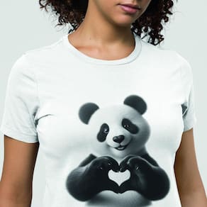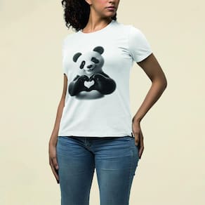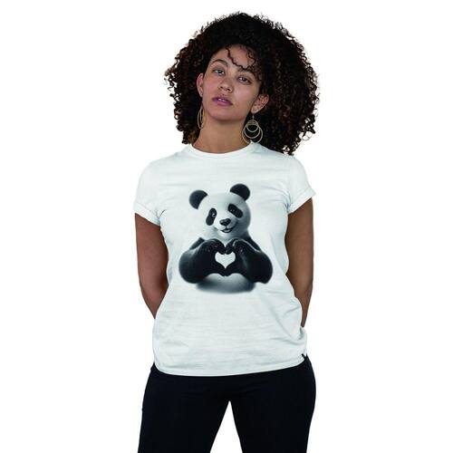 Um panda fofinho, com seus olhos expressivos e orelhas adoráveis, forma um coração com as próprias patinhas. A simplicidade e ternura dessa estampa transmitem uma mensagem de amor e carinho universal.