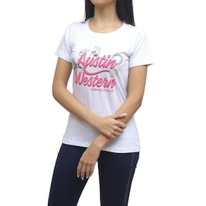 Camiseta Feminina na qualidade Austin Western, fabricada em tecido 100% Algodão na cor Branco, possui mangas curtas, gola tradicional, estampa com pedrinhas strass na parte frontal. Sendo um peça perfeita para seu dia a dia, podendo ser usada em diversas situações!