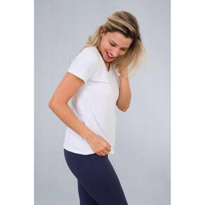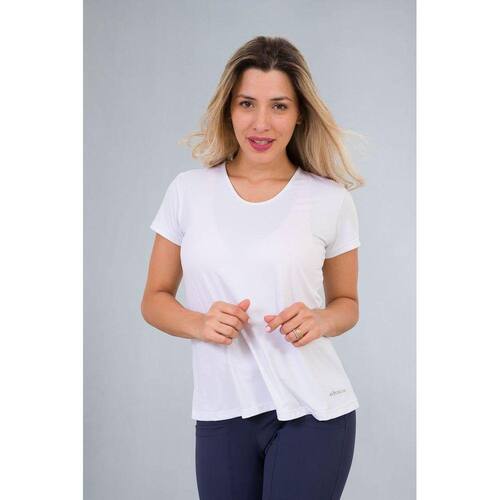 T-shirt feminina Branca para academia, mais soltinha na cintura estilo bata. Excelente opção também para pilates, crossfit, corrida ou casual.