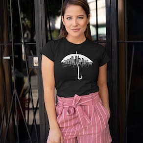Estampa de um guarda-chuva em forma de prédios adornam o design. Camiseta com um toque urbano e cheio de estilo. Vista-se e mantenha-se preparado para enfrentar qualquer clima com elegância.
