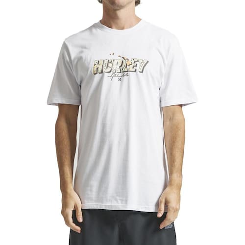 Camiseta Hurley silk, meia malha 30.1, gola rebatida, modelagem regular, estampa localizada a base d'água e etiqueta clips na barra.