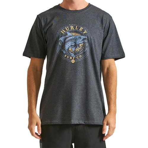 Camiseta Hurley feita em meia malha 30.1, estampa frontal localizada, etiqueta clips na barra e silk interno.