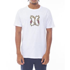Camiseta Hurley meia malha 30.1, estampa frontal localizada, etiqueta clips na barra, silk interno, modelagem regular e etiquetas personalizadas.
