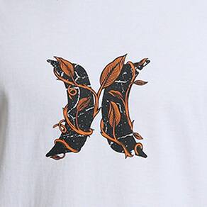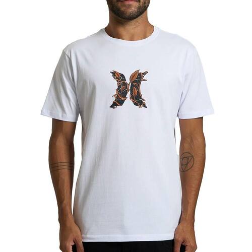 Camiseta Hurley feita em meia malha 30.1, gola rebatida, estampa localizada base d'agua e etiqueta clips ONE&ONLY na barra.