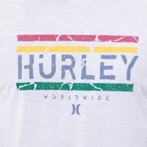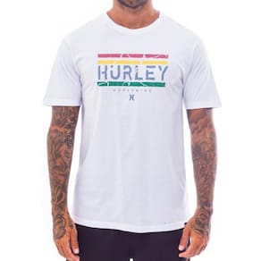Camiseta Hurley feita em meia malha 30.1, gola rebatida, estampa localizada base d'agua e etiqueta clips ONE&ONLY na barra.