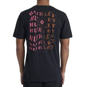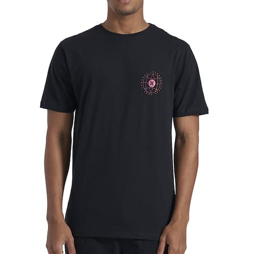 Camiseta Hurley feita em meia malha 30.1, gola rebatida, estampa localizada base d'agua e etiqueta clips ONE&ONLY na barra.