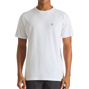 Camiseta Hurley feita em meia malha 30.1, gola rebatida, estampa localizada base d'agua e etiqueta clips ONE&ONLY na barra.