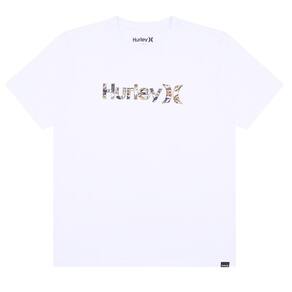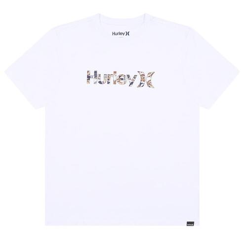 Camiseta Hurley feita em meia malha 30.1, gola rebatida, estampa localizada base d'agua e etiqueta clips ONE&ONLY na barra.