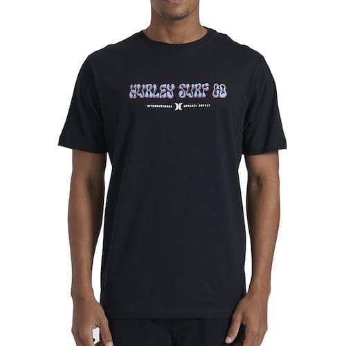 Camiseta Hurley feita em meia malha 30.1, gola rebatida, estampa localizada base d'agua e etiqueta clips ONE&ONLY na barra.