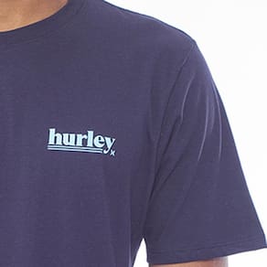 Camiseta Hurley meia malha 30.1, estampa frontal localizada, etiqueta clips na barra, silk interno, modelagem regular e etiquetas personalizadas.