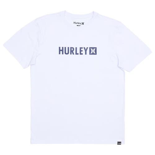 Camiseta Hurley feita em meia malha 30.1, gola rebatida, estampa localizada base d'agua e etiqueta clips ONE&ONLY na barra.