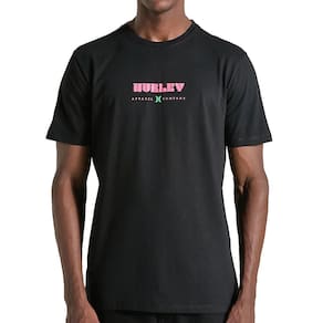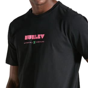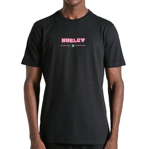 Camiseta Hurley feita em meia malha 30.1, gola rebatida, estampa localizada base d'agua e etiqueta clips ONE&ONLY na barra.