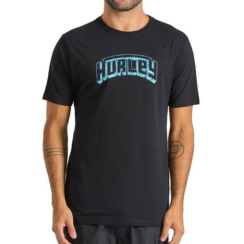 Camiseta Hurley feita em meia malha 30.1, gola rebatida, estampa localizada base d'agua e etiqueta clips ONE&ONLY na barra.