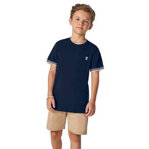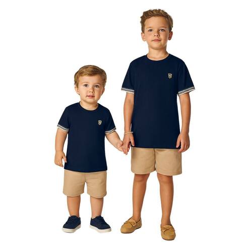 Ideal para quem busca um look moderno e confortável para os pequenos, essa camiseta infantil da Trick Nick é confeccionada em cotton leve, oferecendo toque suave à pele e liberdade de movimento. O tom azul marinho com detalhes em retilínea nas mangas e gola traz um charme especial, combinando com bermudas ou calças para diversas ocasiões.