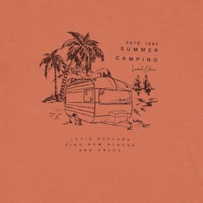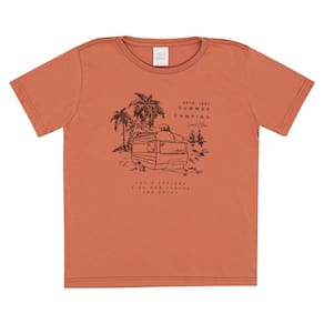 Peça divertida e moderna para acompanhar seu pequeno em todos os momentos do dia a dia. Confeccionada em meia malha na cor ferrugem, possuí gola redonda e estampa frontal de acampamento na praia com escrita "Acampamento de verão. Vamos explorar encontre novos lugares e aproveite. Desde 1985 edição limitada".