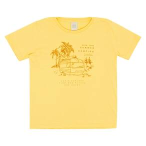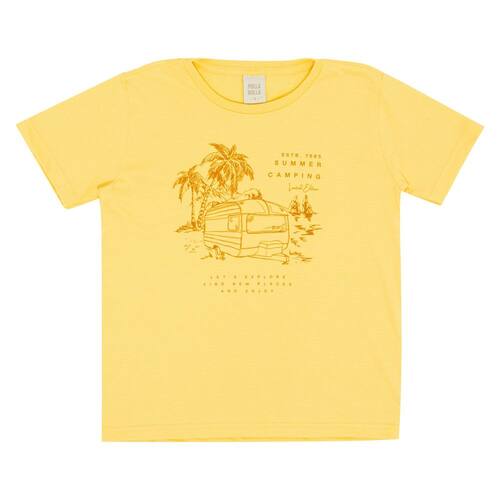 Peça divertida e moderna para acompanhar seu pequeno em todos os momentos do dia a dia. Confeccionada em meia malha na cor sol, possuí gola redonda e estampa frontal de acampamento na praia com escrita "Acampamento de verão. Vamos explorar encontre novos lugares e aproveite. Desde 1985 edição limitada".
