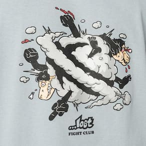 Camiseta Lost feita em meia malha penteada 30.1, estampa frontal e etiquetas personalizadas.