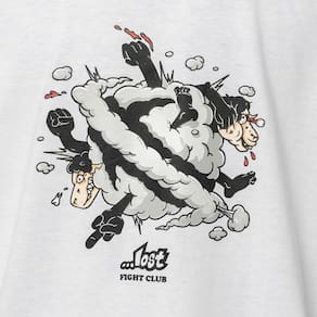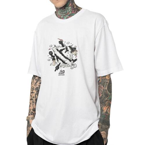 Camiseta Lost feita em meia malha penteada 30.1, estampa frontal e etiquetas personalizadas.