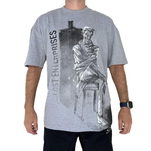 Camiseta Lost feita em modelagem Boxfit, reforço de gola, etampa localizada na frente, etiqueta embutida aplicada na lteral e etiqueta sanduíche localizada na barra costas.