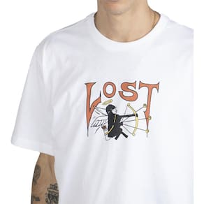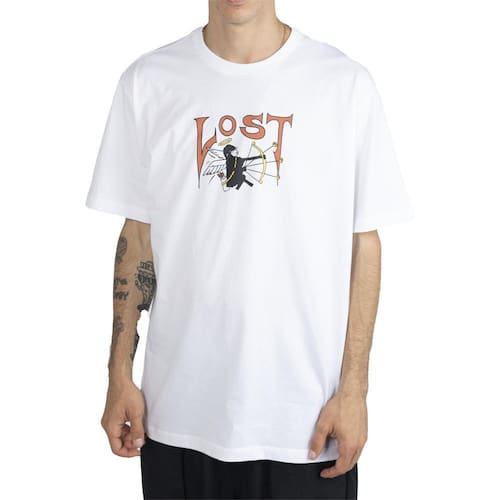 Camiseta LOST com tecido meia malha 30/1, modelagem regular, silk frontal e etiquetas personalizadas.