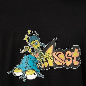 Camiseta Lost feita em meia malha penteada 30.1, estampa frontal e etiquetas personalizadas.