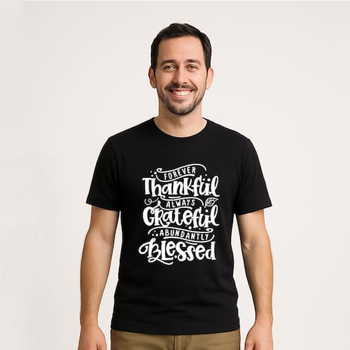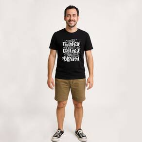 Nossa camiseta preta com a frase "Agradecido, Grato e Abençoado, Blessed" é mais do que uma peça de roupa — é uma declaração de espírito.
