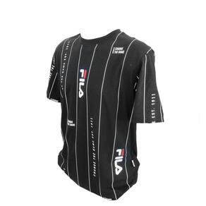 Camiseta masculina confeccionada em malha de poliéster com textura quadriculada. A modelagem raglan com manga curta proporciona maior liberdade de movimentos. As laterais deslocadas para frente e as costuras sem atrito com o corpo garantem maior conforto durante o uso. Possui gola careca, cobregola pespontado, e maxi estampa Fila Letter Outline em alto relevo centralizada na parte frontal.
