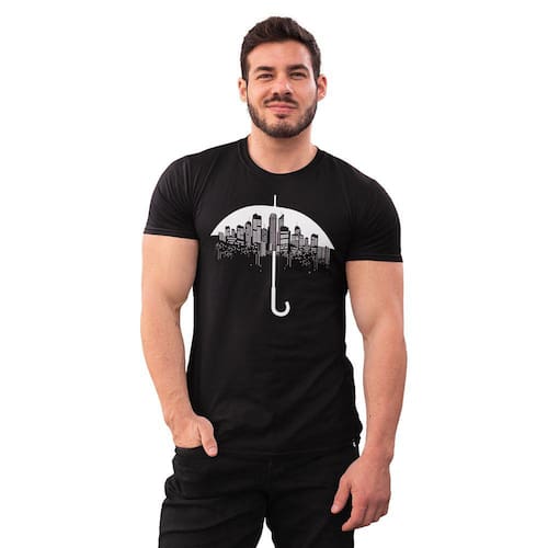 Estampa de um guarda-chuva em forma de prédios adornam o design. Camiseta com um toque urbano e cheio de estilo. Vista-se e mantenha-se preparado para enfrentar qualquer clima com elegância.