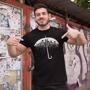 Estampa de um guarda-chuva em forma de prédios adornam o design. Camiseta com um toque urbano e cheio de estilo. Vista-se e mantenha-se preparado para enfrentar qualquer clima com elegância.