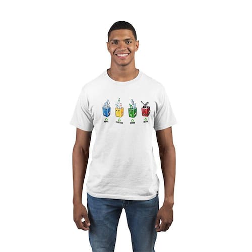 Essa camiseta é pesada como o metal e tão ecológica quanto uma floresta, em tecido 100% algodão! Com a estampa bem humorada de lixeiras de reciclagem estilizadas, você vai arrasar no palco da sustentabilidade. Headbangue de uma forma cômica enquanto ajuda o planeta!