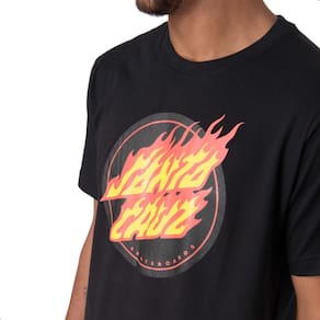 O grande destaque desta camiseta é a icônica estampa "Flaming Dot" da Santa Cruz, posicionada na parte frontal. Este design audacioso e vibrante é um símbolo reconhecido mundialmente na cultura do skate, refletindo a essência e a energia da marca Santa Cruz.