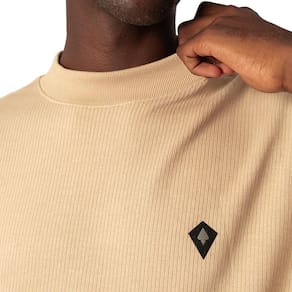 Camiseta Mcd feita em modelagem box fit, malha colete, logo espada na lateral do peito e etiquetas personalizadas.