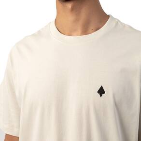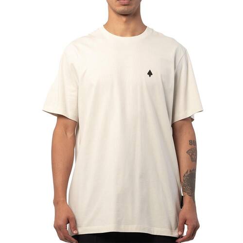 Camiseta MCD feita em malha penteada 30.1, logo espada no peito e etiquetas personalizadas.
