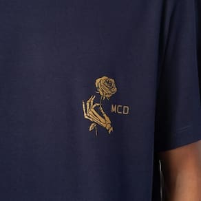 Camiseta MCD feita em malha penteada 30.1, estampa no peito e etiquetas personalizadas.
