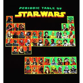 Eu me pergunto onde você encontraria midichlorianos em uma tabela periódica de elementos? Onde quer que esteja, você pode pelo menos encontrar alguns de seus personagens favoritos de uma galáxia muito, muito distante nesta camiseta oficialmente licenciada de Star Wars! Com uma tabela periódica repleta de alguns dos rostos mais memoráveis da história da franquia, essa camiseta da Tabela Periódica de Star Wars certamente agradará a quase todos os fãs.