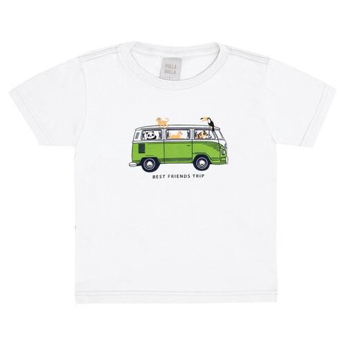 Para brincar com os amiguinhos durante os dias quentes nada como um lookinho super leve e fresquinho para acompanhar a energia dos pequenos. Camiseta em meia malha na cor branca com estampa de kombi com escrita "Viagem de melhores amigos. Aventura até o fim".