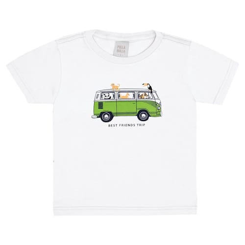 Para brincar com os amiguinhos durante os dias quentes nada como um lookinho super leve e fresquinho para acompanhar a energia dos pequenos. Camiseta em meia malha na cor branca com estampa de kombi com escrita "Viagem de melhores amigos. Aventura até o fim".