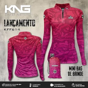 CAMISETA DE PESCA KING BRASIL COM PROTECAO SOLAR UV 50+ (KFF614) - FEMININA \nCamisa com proteção Solar, Tamanhos P ao GG \nProtege a Pele dos Efeitos nocivos do Sol \nUv protection e o fio inteligente que protege sua pele da ação dos raios UV-A e UV-B com fator de proteção solar de 30+ a 50+. \nPara os mais exigentes, as camisas da King Brasil com proteção UV protegem a pele durante a exposição ao sol com maior conforto e funcionalidade. \nDevido a modificações no DNA do fio, essa funcionalidade tem ação prolongada durante toda vida útil do produto. \nE a alta tecnologia e segurança que você sente na pele. \n- 100% poliéster\n- Proteção Solar UV\n- Impressão é feita em papel Epson de alta qualidade durável toda vida útil do produto.\n- Gola padre\n- Corte raglã\n- Tecido Tecno Dry Fit \n- Tecnologia de alta Absorção\n- Tecido leve\n- Conforto Térmico\n
